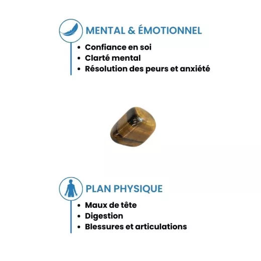 L'Œil de Tigre est une pierre roulée de couleur brun doré avec des bandes lumineuses qui lui ont donné un aspect rayé rappelant l’œil d’un tigre. Cette pierre est utilisée en lithothérapie pour ses différents effets sur le physique comme le renforcement du métabolisme et de la digestion. En outre, elle présente aussi des aspects spirituels comme la confiance en soi et la protection des ondes négatives.