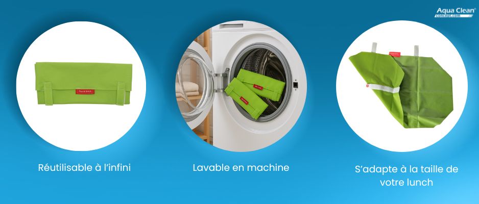 Cette pochette à lunch ajustable a été conçue par la marque belge Flax & Stitch. Cette société, largement médiatisée, fabrique de nombreux articles qui ont pour vocation de réduire les emballages. Incontournable dans le secteur des produits zéro déchet en Europe, la marque rencontre beaucoup de succès car elle propose un choix grand choix de motifs très attrayants et contemporains. En plus des pochettes à lunch réutilisables, Flax & Stitch propose des sacs de congélation réutilisables, des sacs à vracs ou encore des lavettes 100 % biodégradables !