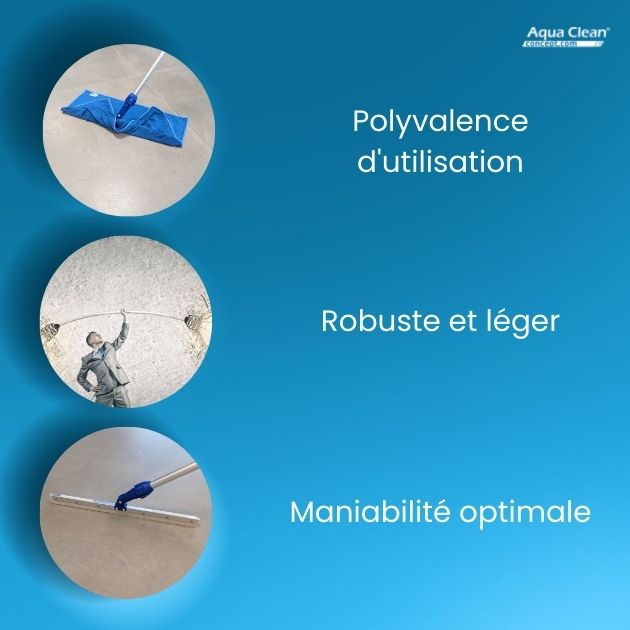 - Adaptable sur les manches Aqua Clean Concept : vous avez le choix entre deux manches Aqua Clean Concept à emboiter sur votre base à racler. Le manche ergonomique pour plus de confort et le télescopique qui s’adapte aux personnes de petites et grandes tailles ;