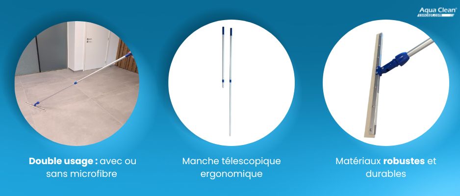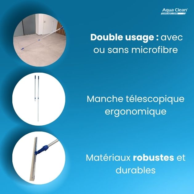 Aqua Clean Concept propose divers articles en microfibres ajustables à cette base à racler. Utilisés imbibés d’eau ou à sec, ces chiffons en microfibre aimantent la poussière et redonnent leur éclat aux surfaces les plus encrassées. - Sans microfibre : Cette raclette peut également s’employer de façon classique, sans serpillière. Elle est fabriquée dans une mousse à forte densité et rigide. Elle permet de racler du liquide ou simplement de ramasser des saletés diverses.