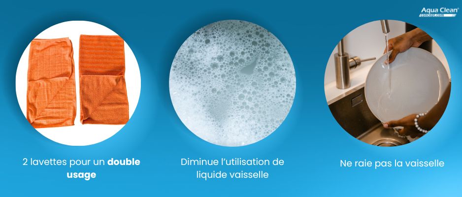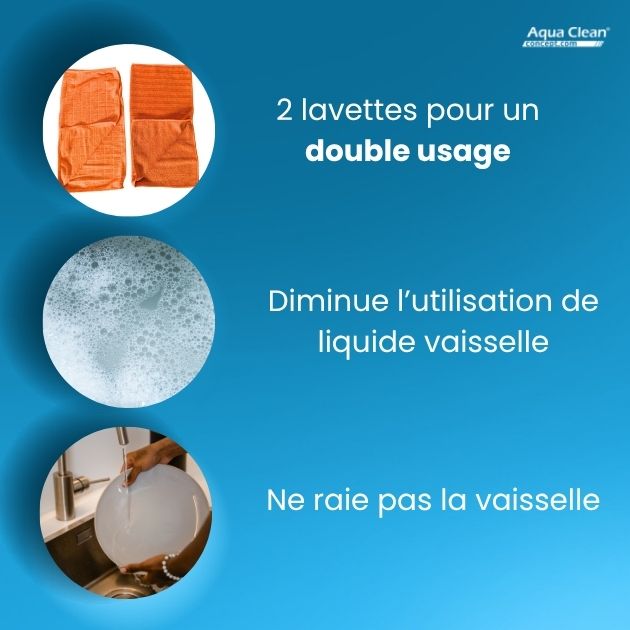Astuce : il est possible de combiner les deux lavettes pour la vaisselle, passez la plus agressive pour nettoyer et ensuite la plus douce à sec pour essuyer.