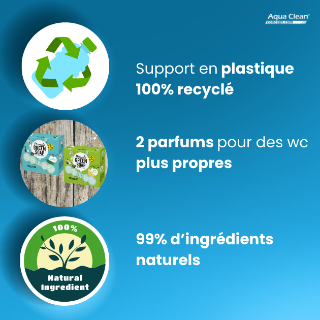 Contrairement aux blocs WC traditionnels chargés de produits chimiques nocifs, le bloc WC de Marcel's Green Soap se distingue par :