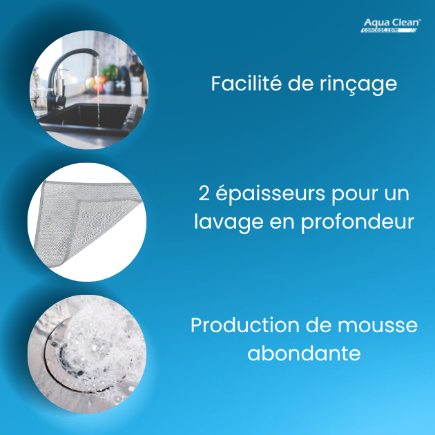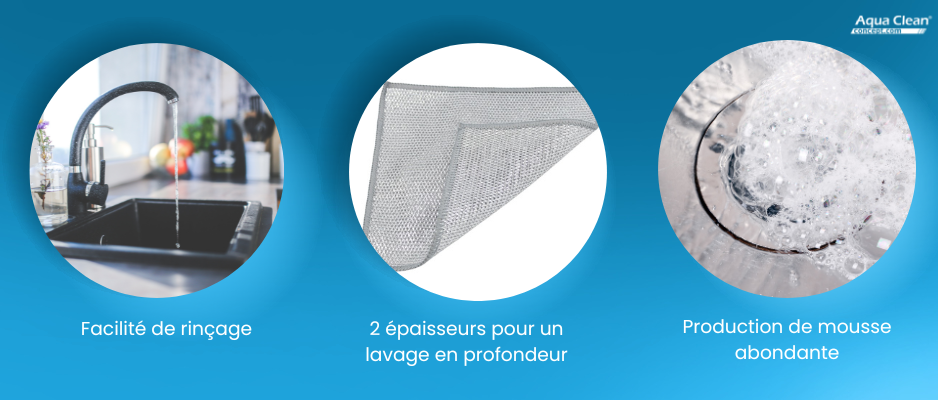 - Une facilité de rinçage : sa structure à grille fine permet un nettoyage rapide sans accumulation de résidus. En effet, les déchets ne restent pas accrochés à la lavette et sont éliminés en un seul rinçage;