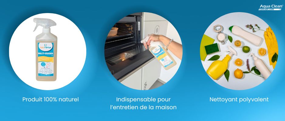 - Polyvalent, ce nettoyant naturel multi-usage s’attaque à toutes les taches, sur toutes les surfaces, de la voiture à la cuisine. 100% naturel, il est en effet aussi compatible avec le contact alimentaire (fours, plaques de cuisson, etc.).