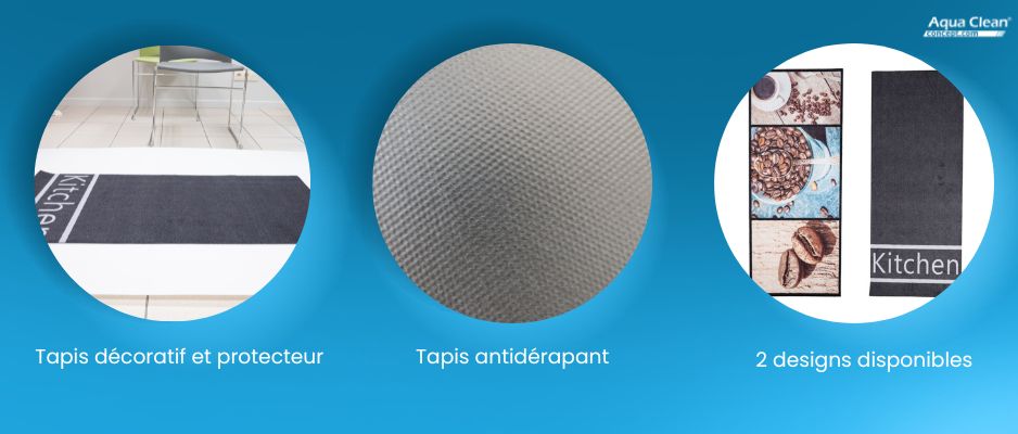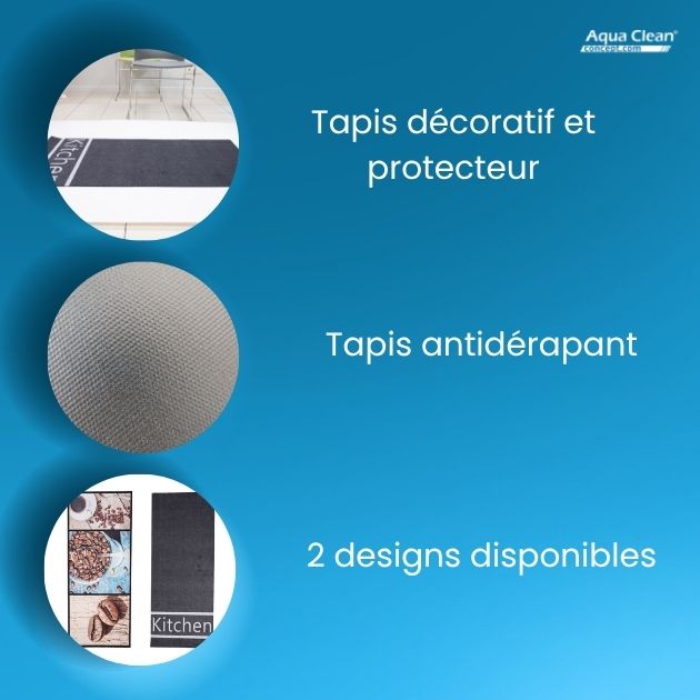 Également utilisé comme objet décoratif, le tapis viendra apporter une touche design à votre cuisine. Aqua Clean Concept propose deux modèles de paillassons décoratifs et protecteurs :