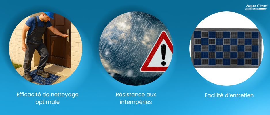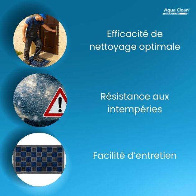 Le tapis extérieur se veut être un parfait complément de votre carpette hyper absorbante pour l’humidité et anti-poussière installée à l’intérieur et également vendue par Aqua Clean Concept. En effet, le paillasson extérieur est utile pour décrasser les grands résidus comme des morceaux de boue ou de terre mais ne possède pas les caractéristiques des autres tapis intérieurs (anti-poussière et anti-humidité donc). Par ailleurs, il a été conçu pour résister aux intempéries (pluie, gel, tempête, etc.) et à l’exposition au soleil.