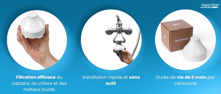 Contrairement aux filtres de douche standard, la cartouche Tappwater ShowerPro offre une filtration plus complète en ciblant spécifiquement le calcaire, le chlore et les métaux lourds. Cette efficacité accrue se traduit par une eau de meilleure qualité, sans compromettre le débit de votre douche.